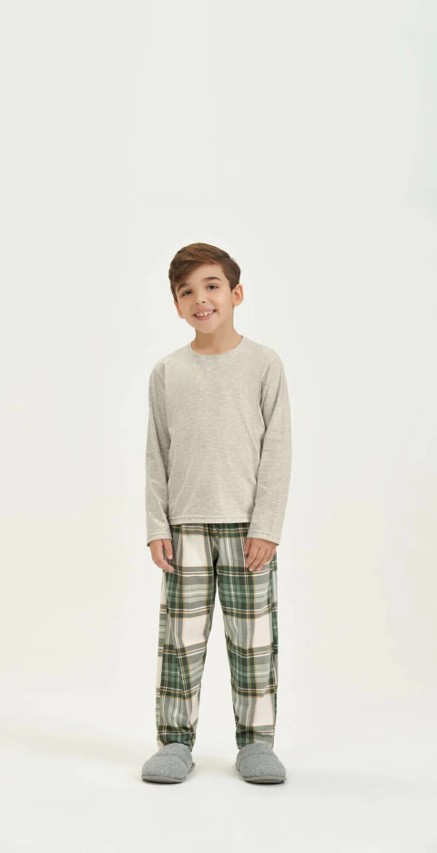 Pijama manga longa com blusa em malha blend, blusa de modelagem tradicional, lisa, decote canelado. Calça em malha comfort 100% algodão com estampa xadrez de modelagem reta e elástico 2 cm. Conjunto confortável e moderno que combina com a família inteira! Na compra deste pijama você ainda irá ganhar uma bandana de mesma estampa para seu pet!